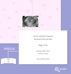 · Polka dot gate-fold card · Personalized black & white glossy photo closure · Up to 6 lines of text (inside) · Actual size folded ~3.25" x 4.75" · Sample Wording