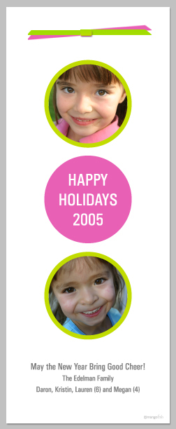 · Personalized with 2 color photos · Custom message in center circle · Personal 3 line greeting at bottom · Satin ribbons in complimentary colors · Shiny silver cardstock back · Actual size ~3.50" x 8.5" · Matching silver policy (end flap) envelope